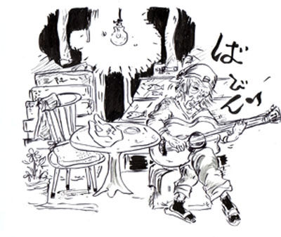 夕闇のなかで店主がギターを弾いていた。